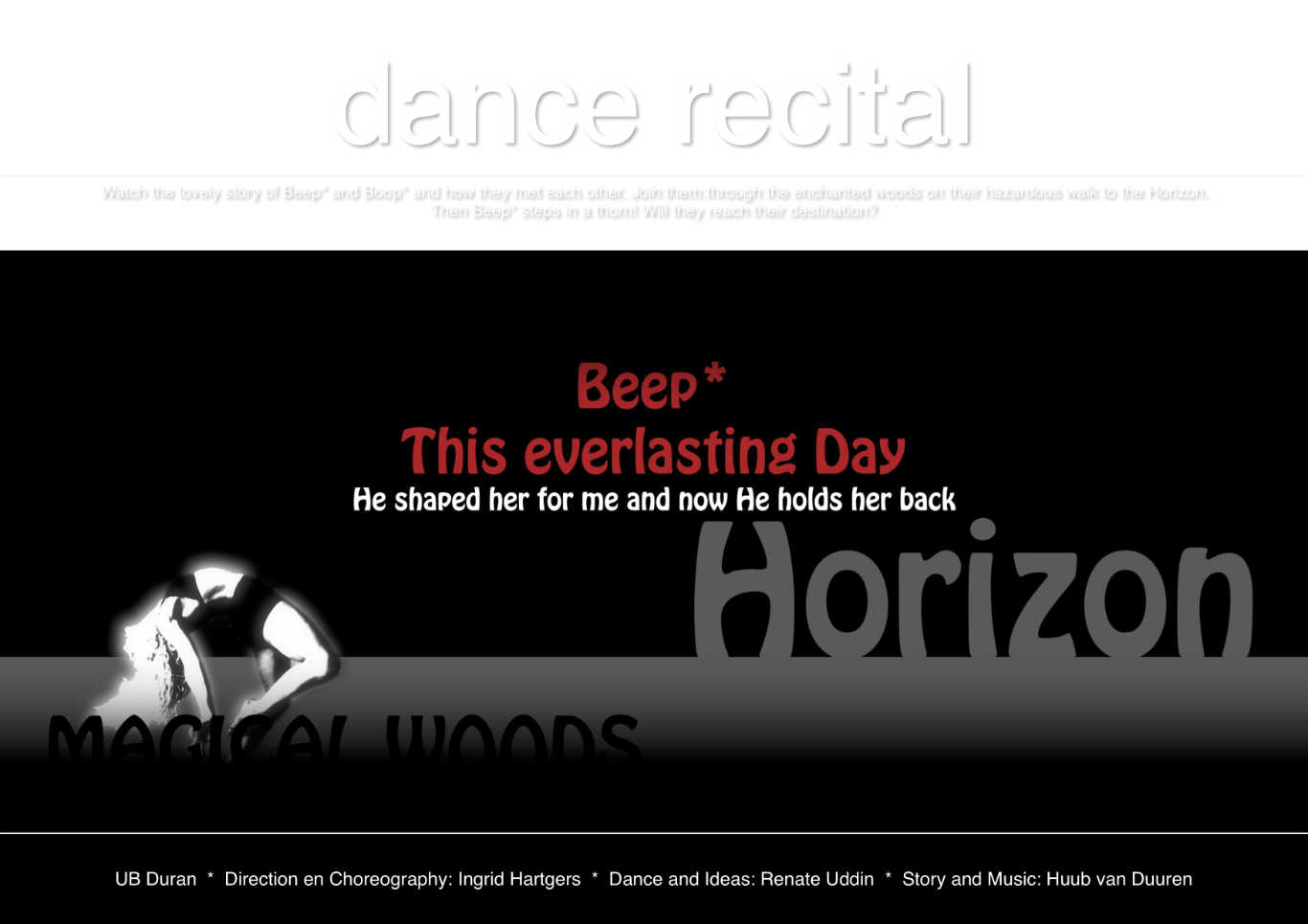Dance Promovideo Beep* is the name of a stunning beauty whose name can not be mentioned. In three acts the dance moves through the story following the intriguing three musical albums by UB Duran that listen to the same name: Beep*.The 1st act paints the everlasting day wherein Beep* and Boop* explore their feelings for each other and why God put them together without manuals. The 2nd album is about Pain and Believe. And the 3rd album shows how Love finds a beautiful sense and place in life. Come and see how the wind breezes the seed of love from stone square yards through enchanting woods to the Horizon and far REALLY far beyond. So join the experience of matching souls, the effort to understand His work and the search for the moment of believe with its creative powers.