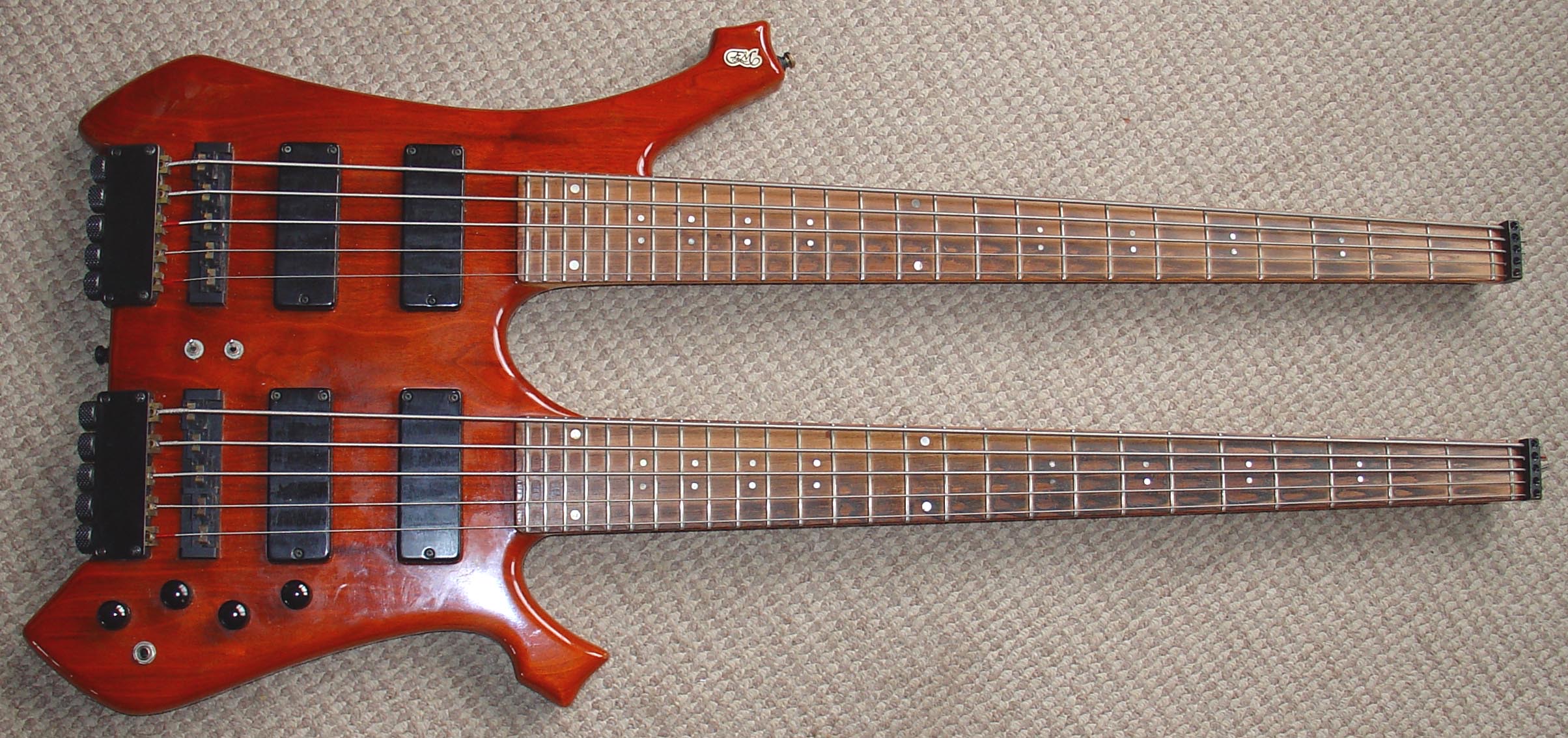 hand crafted a beautiful walnut body with maple and purperhart laminated necks. Low strings and high strings have their separate outputs. An instrument UB still plays with great pride today.